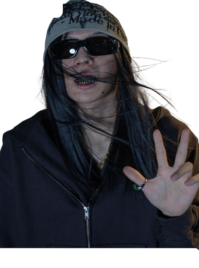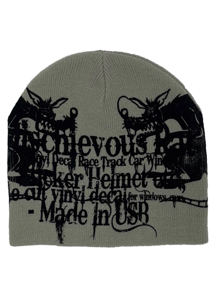 Stretch-fit knit beanie in washed army green with black overprint graphics. The text and dragon artwork give it that rough, mid-2000s bootleg feel — clean but chaotic.
