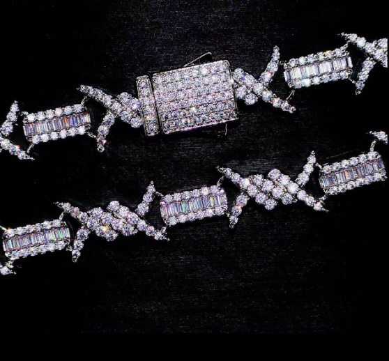 Chain necklace constructed with repeating barbed wire–style links. Features a continuous design with consistent spacing and a uniform metal finish. Designed to sit evenly around the neck with balanced weight distribution.