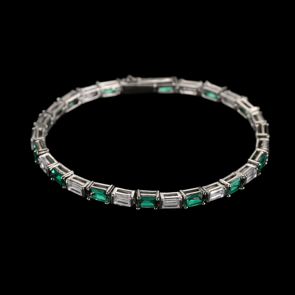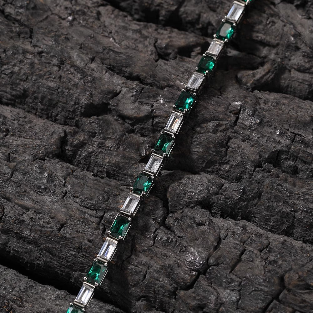 Crafted with a silver-tone electroplated finish and set with alternating baguette-cut emerald and white stones. Featuring flawless 5A-grade cubic zirconia for a crystal-clear shine, this piece blends elegance and edge with every detail.