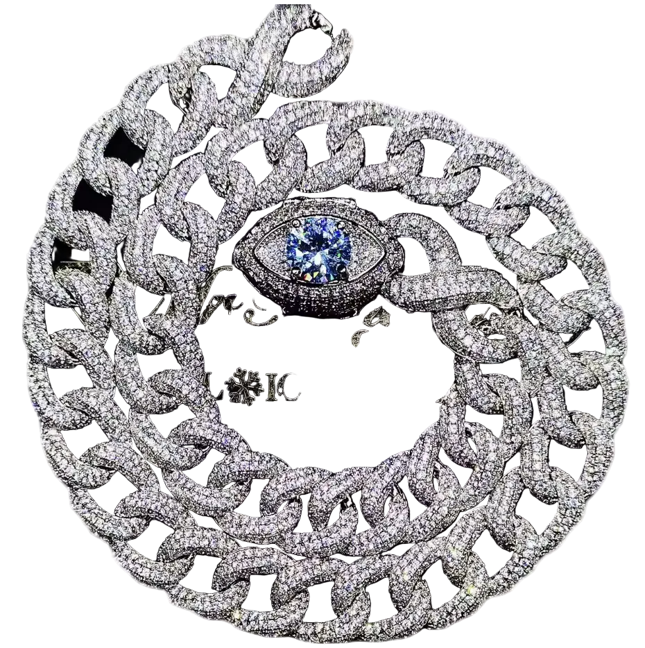 Cuban link necklace with a fixed central eye detail. Constructed with uniform links and a smooth metal finish. Designed to sit evenly around the neck with a balanced weight.