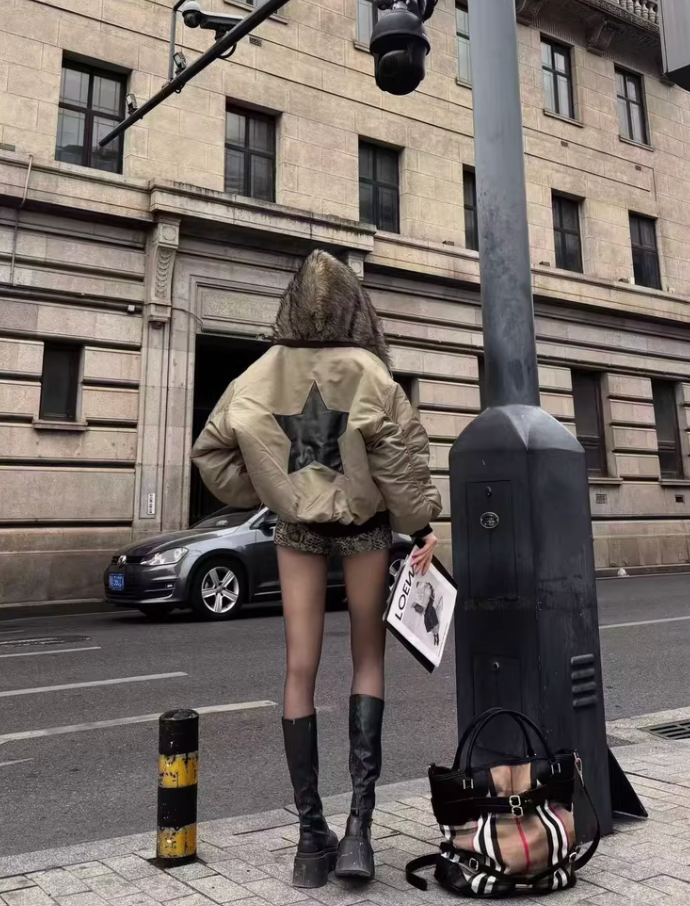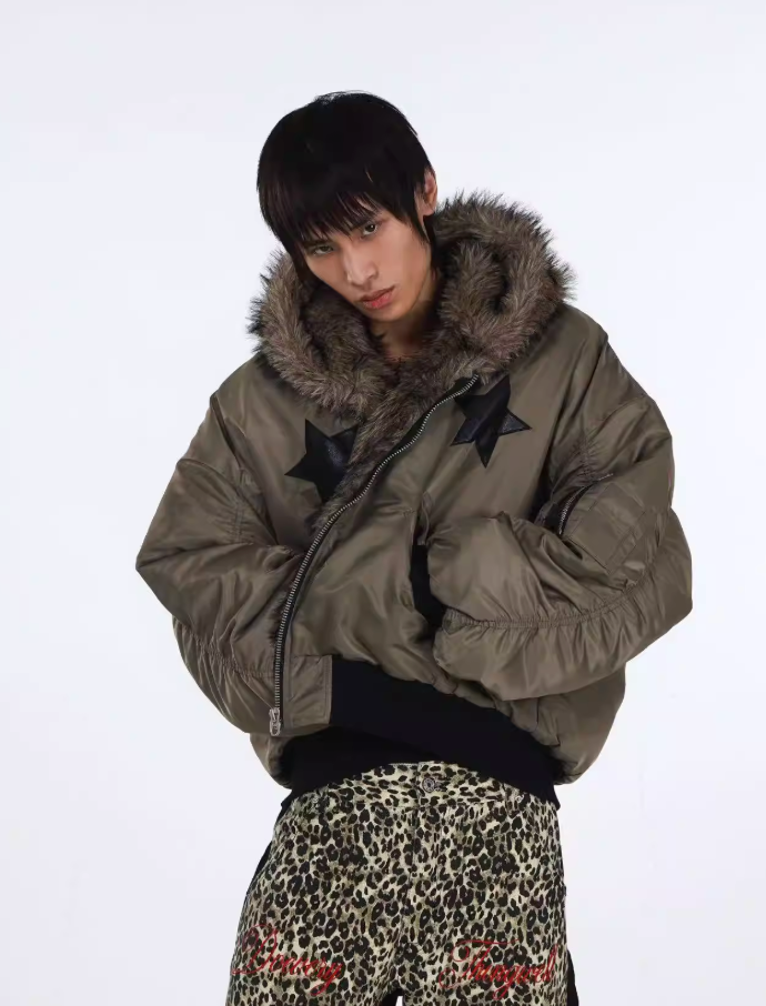 Bomber jacket with a relaxed silhouette and oversized faux fur hood. Quilted construction with a full front zip closure and insulated build for cold-weather wear. Designed with a slightly cropped profile and volume through the body.